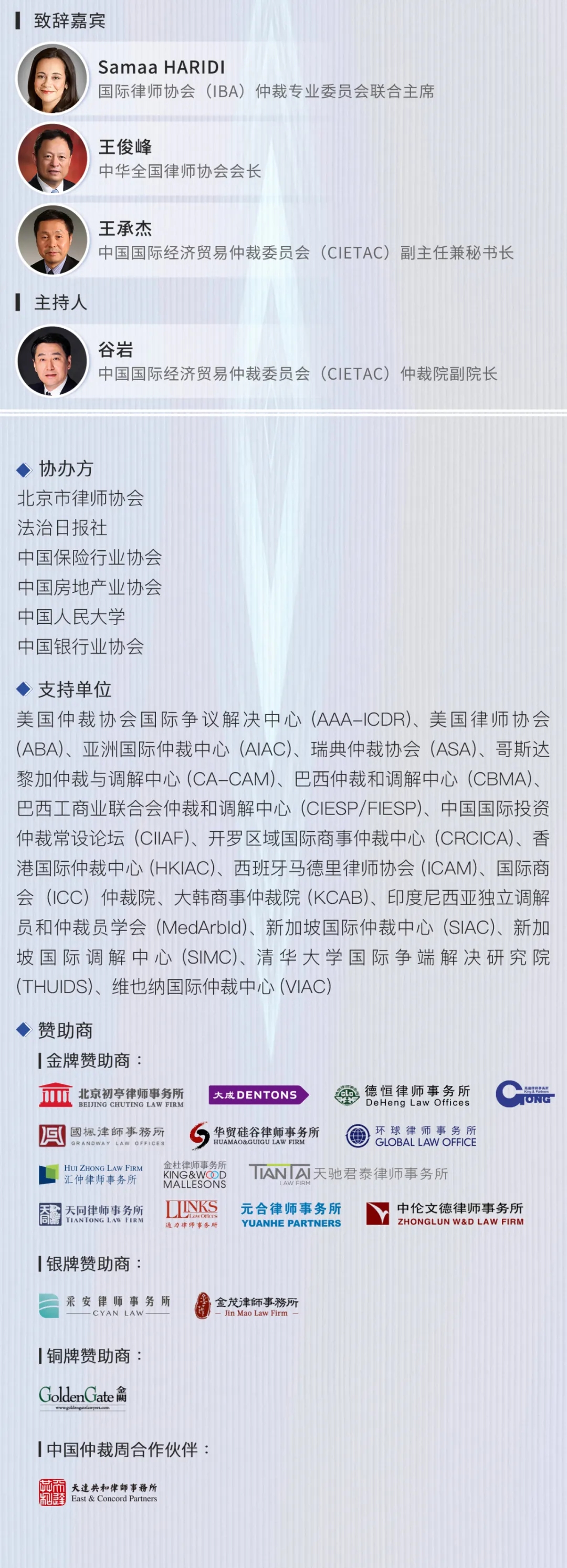 近年來,國家高度重視仲裁事業(yè)的發(fā)展,對新時代背景下仲裁制度的完善及仲裁公信力的提升提出了新的要求。在本議題下,演講者將就仲裁制度的新發(fā)展、多元糾紛解決機制及“一站式”爭議解決平臺建設、仲裁公信力的提升、當事人意思自治與機構規(guī)則間的交融等內(nèi)容展開交流。