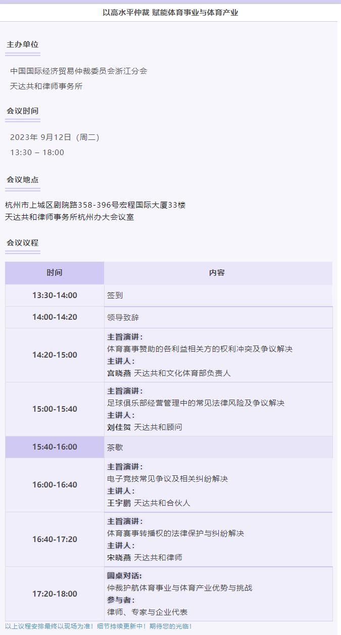 今年6月24日,新修訂的《中華人民共和國體育法》頒布一周年。一年來,我國體育仲裁與體育商事仲裁事業(yè)雙雙迎來快速發(fā)展。值此杭州亞運(yùn)會(huì)盛大召開之際,現(xiàn)擬在第十一屆中國仲裁周期間舉辦專場論壇,深度探討如何以高水平仲裁,賦能體育事業(yè)與體育產(chǎn)業(yè),探索體育糾紛及體育相關(guān)商事糾紛解決路徑,為我國的體育事業(yè)和產(chǎn)業(yè)發(fā)展提供法律視角、貢獻(xiàn)專業(yè)智慧。