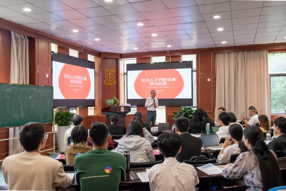 原美的集團(tuán)全球法務(wù)總監(jiān)、貿(mào)仲仲裁員陳敏作專題演講。陳敏談到,法治人才的職業(yè)素養(yǎng)并不是一種知識,而是一種訓(xùn)練,法學(xué)院的學(xué)生應(yīng)當(dāng)具備的職業(yè)素養(yǎng)包括樹立證據(jù)意識、做事留痕、具備批判思維和審慎品質(zhì)等。法治人才的難得在于不但需要有扎實(shí)的法律知識,還需要具備更多其他行業(yè)的基礎(chǔ)知識,必須有意識地突破自己的職業(yè)局限,多方面培養(yǎng)自己的知識體系。他還以網(wǎng)絡(luò)熱詞為例,談?wù)摿四壳暗纳鐣?huì)就業(yè)情況及學(xué)子們進(jìn)入職場后可能會(huì)遇到的問題,并給出了解決方式和建議。最后,他以“主動(dòng)權(quán),決定生存權(quán)”作為結(jié)束語,呼吁學(xué)子們厚積薄發(fā),主動(dòng)把握未來。