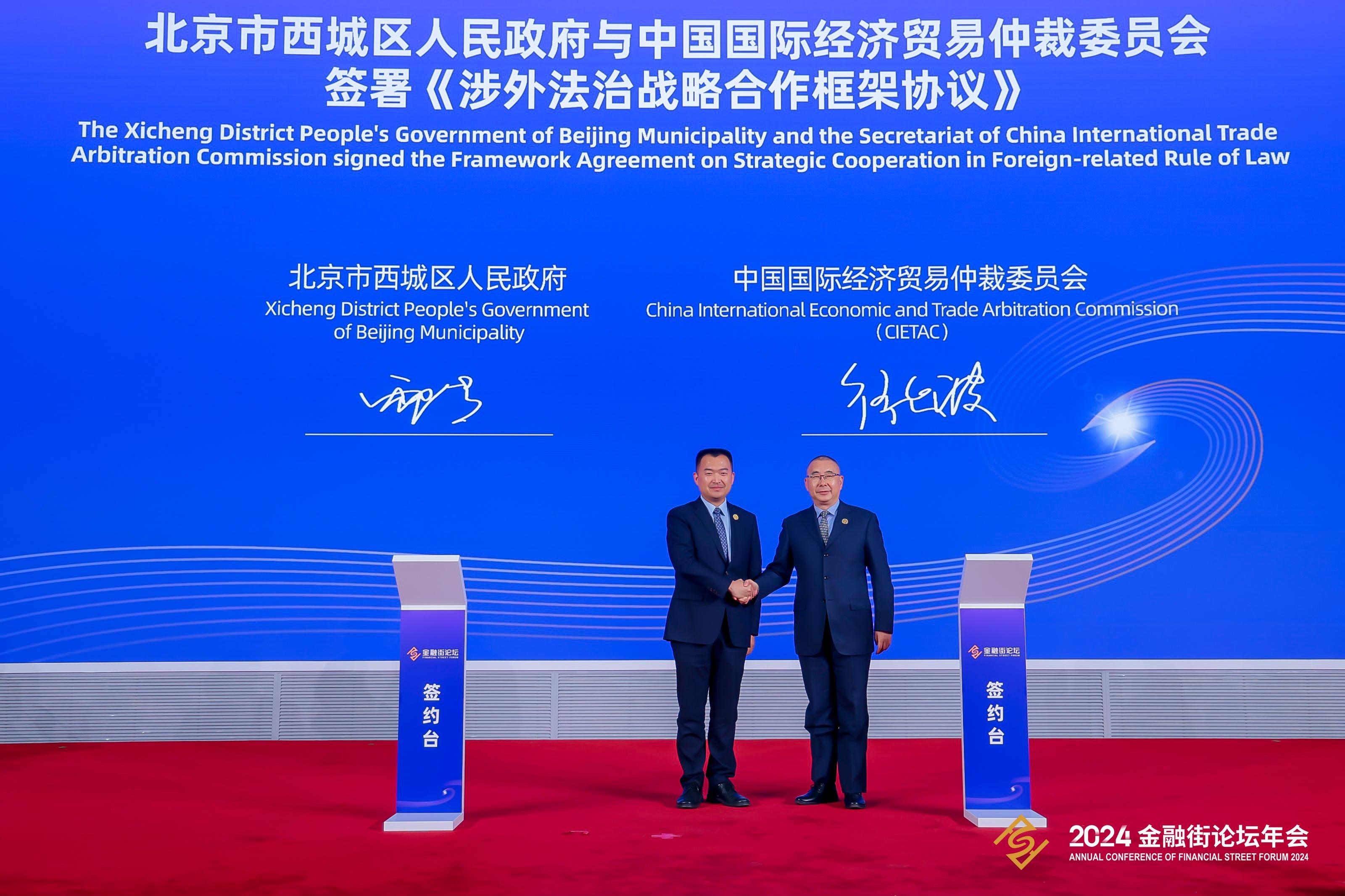 近日,在北京金融街服務(wù)局和中國(guó)經(jīng)濟(jì)信息社聯(lián)合承辦的2024金融街論壇年會(huì)金融街之聲——“金融街發(fā)布”成果專場(chǎng)發(fā)布活動(dòng)上,中國(guó)國(guó)際經(jīng)濟(jì)貿(mào)易仲裁委員會(huì)(以下簡(jiǎn)稱“貿(mào)仲”)與北京市西城區(qū)人民政府簽署《涉外法治戰(zhàn)略合作框架協(xié)議》。貿(mào)仲黨委書記、副秘書長(zhǎng)徐延波與北京市西城區(qū)副區(qū)長(zhǎng)邴浩共同在《涉外法治戰(zhàn)略合作框架協(xié)議》上簽字。