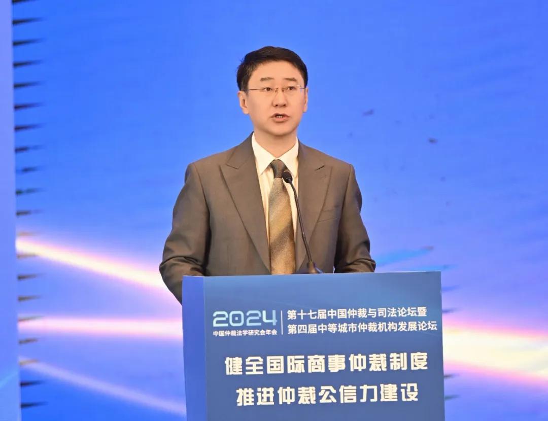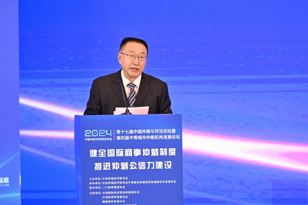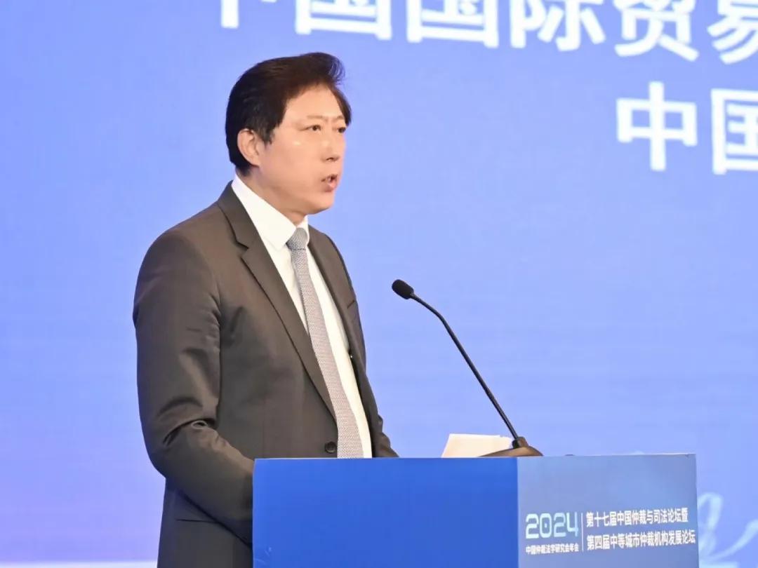 (中國國際貿易促進委員會黨組成員、副會長、中國仲裁法學研究會會長于健龍作開幕致辭)