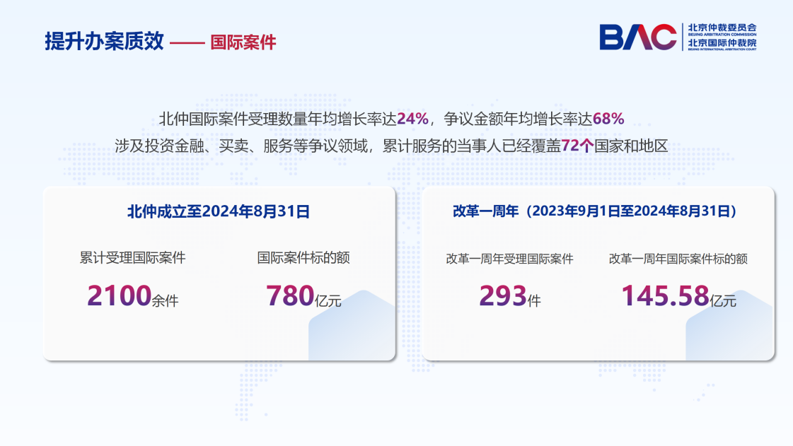 歷經(jīng)十年,北仲的國際化發(fā)展成績斐然。截至2024年8月31日,北仲累計(jì)受理國際案件2100余件,所涉標(biāo)的額達(dá)780億元,主要涉及投資金融、買賣、服務(wù)等爭議領(lǐng)域,累計(jì)服務(wù)的當(dāng)事人已經(jīng)覆蓋72個國家和地區(qū)。其中,改革換屆以來,自2023年9月1日至2024年8月31日,北仲受理國際案件293件,爭議金額達(dá)145.58億元,分別占北仲國際案件受理總量的13.95%和國際案件受理總金額的18.66%。