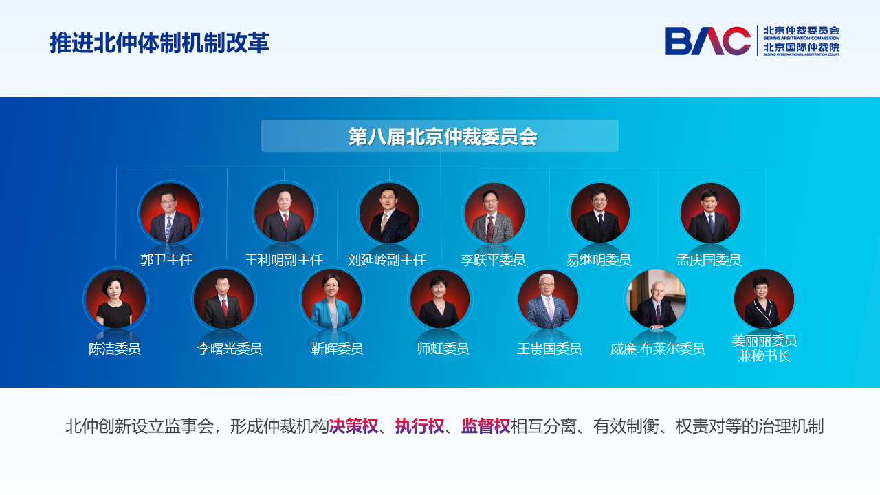 據(jù)介紹,北仲本輪體制機(jī)制改革是以第八屆仲裁委員會換屆為標(biāo)志的。2023年9月,由13位在法律、金融、數(shù)字經(jīng)濟(jì)、知識產(chǎn)權(quán)、國際商事爭議解決等領(lǐng)域的資深專家組成的第八屆北仲委員會成立,其中包括兩名境外專業(yè)人士。同時,北仲創(chuàng)新設(shè)立了監(jiān)事會作為實(shí)體運(yùn)行的監(jiān)督機(jī)構(gòu),與秘書局共同形成了仲裁機(jī)構(gòu)決策權(quán)、執(zhí)行權(quán)、監(jiān)督權(quán)相互分離、有效制衡、權(quán)責(zé)對等的法人治理機(jī)制。