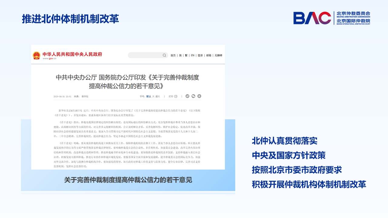 為了打造國際一流的仲裁機(jī)構(gòu)以支撐國際商事仲裁中心建設(shè),北仲認(rèn)真貫徹落實(shí)中央及國家方針政策,按照北京市委市政府要求積極開展仲裁機(jī)構(gòu)體制機(jī)制改革。