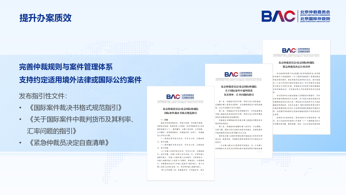 近五年來(lái),北仲處理了大量約定適用境外法律或國(guó)際公約,以及以外語(yǔ)為仲裁語(yǔ)言的案件,具備處理復(fù)雜國(guó)際商事?tīng)?zhēng)議的全球化思維及豐富的經(jīng)驗(yàn),能夠滿足境內(nèi)外當(dāng)事人的多元爭(zhēng)議解決需求。北仲還發(fā)布了與國(guó)際主流實(shí)踐接軌的指引性文件并在實(shí)踐中廣泛適用,比如發(fā)布了《國(guó)際案件裁決書(shū)格式規(guī)范指引》《關(guān)于國(guó)際案件中裁判貨幣及其利率、匯率問(wèn)題的指引》《緊急仲裁員決定自查清單》等。
