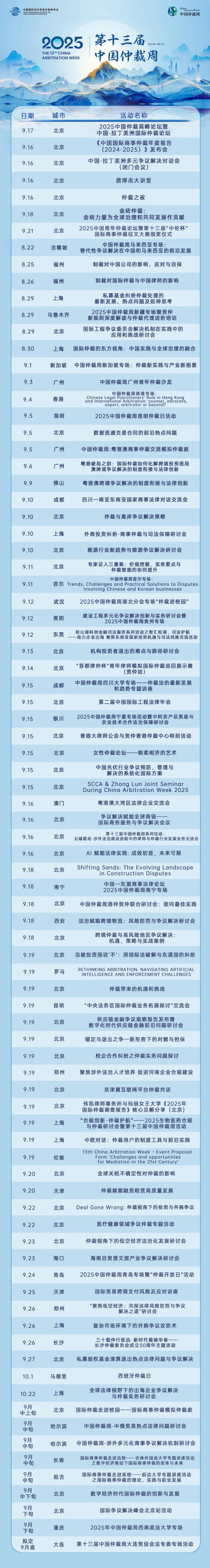 2025年9月,一年一度的中國仲裁周即將如約而來。十三載春秋砥礪,篤定前行,中國仲裁周積極搭建全球仲裁法治交流與合作橋梁,不斷探尋國際商事仲裁發(fā)展前沿,平臺規(guī)模逐步擴(kuò)大,專業(yè)價值與全球影響力日益攀升。目前,2025年中國仲裁周多項專場活動正在加緊籌備,我們期待能與更多新朋老友并肩同行,擁抱數(shù)智,共啟未來。