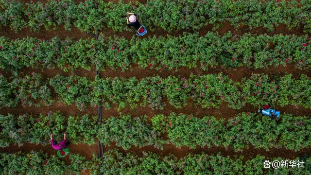 2021年9月9日,小河邊村小組村民在采摘鮮食玫瑰(無(wú)人機(jī)照片)。新華社記者 胡超攝