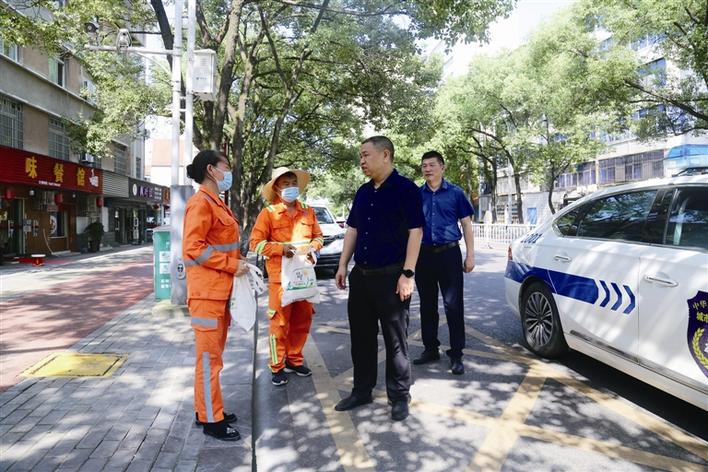 宜都市城市管理執(zhí)法局黨組書記、局長黃志華(右二)為環(huán)衛(wèi)工人“送清涼”