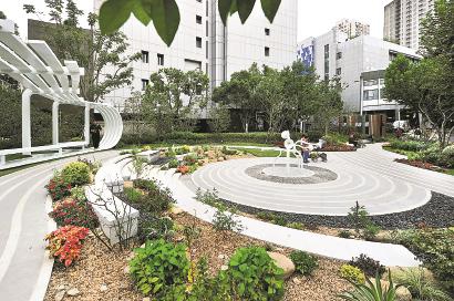 在位于靜安區(qū)膠州路安遠(yuǎn)路交叉口的“音花園”,無障礙步道的鋪設(shè)給腿腳不便,使用嬰兒車、輪椅的市民帶去舒適與便利。視覺中國(guó)供圖