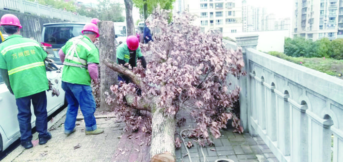 園林工人及時清理樹枝和樹葉。