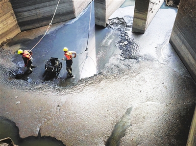 相對(duì)于道路上的管道清淤,泵房?jī)?nèi)的清淤工作要難上許多:工作人員需要下到近10米深、黑暗潮濕的空間中進(jìn)行人工清淤。