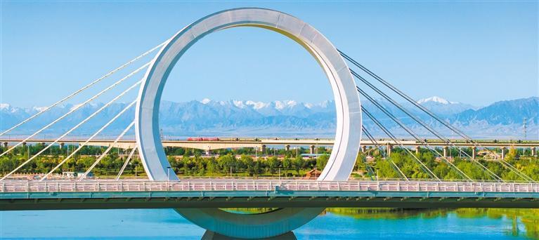 6月10日,甘肅省張掖市甘州區(qū)皓月大橋與祁連山脈和鐵路列車構(gòu)成一幅和美畫卷,吸引游客前來打卡。楊永偉攝(中經(jīng)視覺)