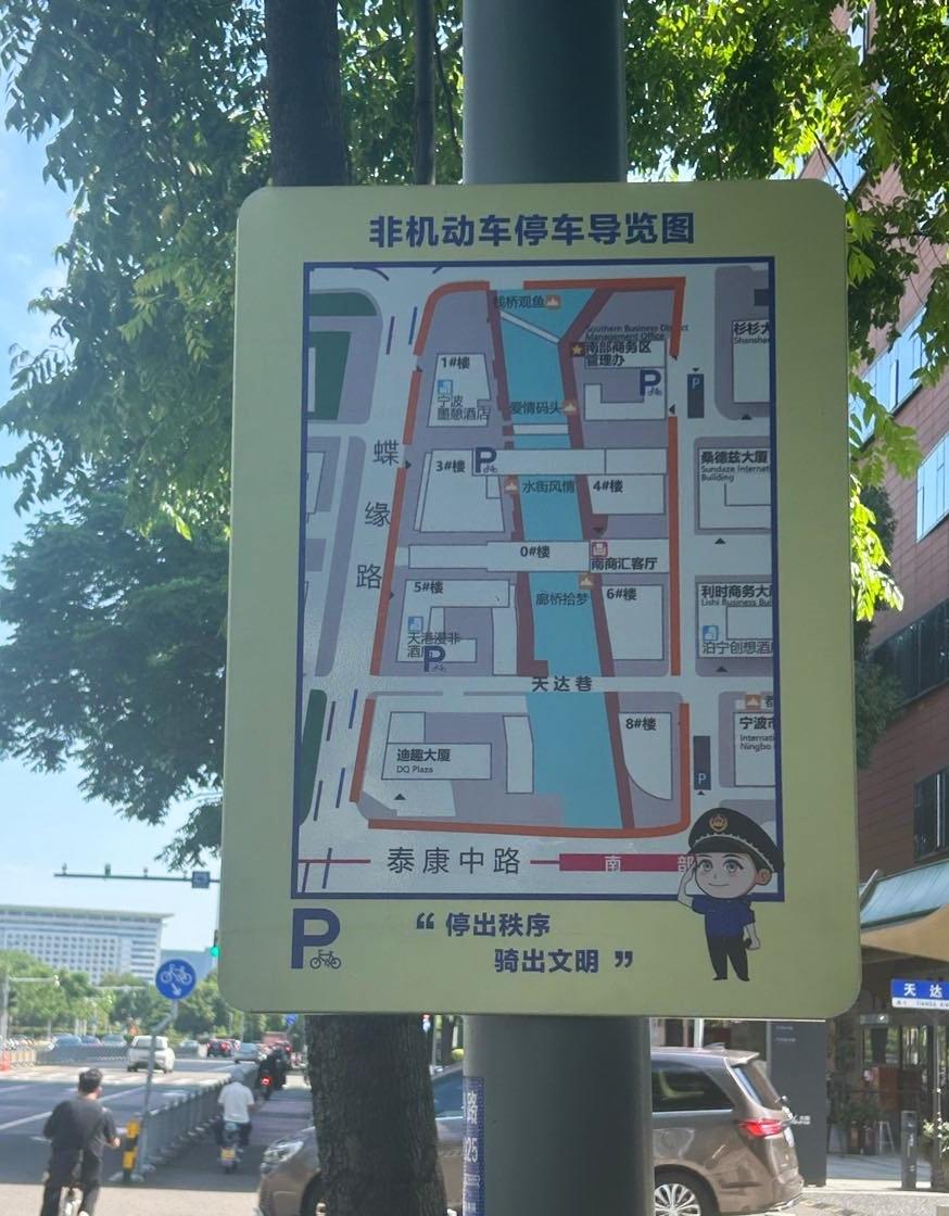 治理有力還需疏導有法。在開展集中整治的同時,南部商務區(qū)中隊秉持“服務為先”理念,一方面精心選擇13處醒目點位設置動漫普法宣傳牌、非機動車停放導覽圖,引導市民文明出行、規(guī)范停車;另一方面,逐一走訪樓宇物業(yè),指導其結合實際需求,合理劃設外賣車輛專屬停車區(qū)域,既充分滿足車輛停放需求,又有效規(guī)范停車秩序,目前已指導設置外賣車輛專屬停車位6處。