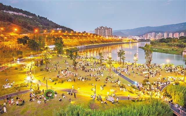 7月13日,夜幕降臨,重慶市開州區(qū)濱湖公園夜色迷人,城市、湖水、草坪相映成趣,吸引眾多市民前來休閑納涼,樂享綠色健康生活。