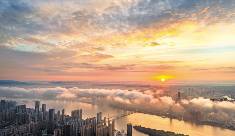 經(jīng)過(guò)23日的降水后,7月24日清晨,長(zhǎng)沙在云霧繚繞中迎來(lái)絕美日出。高空俯瞰,湘江如絲帶穿城而過(guò),一江兩岸,鱗次櫛比的建筑群在云海中“現(xiàn)身”。初升的太陽(yáng)灑下暖金光芒,江水、山巒與橋梁、城市輪廓交融,構(gòu)成現(xiàn)實(shí)版“天空之城”,美不勝收。記者 郭雨滴 攝