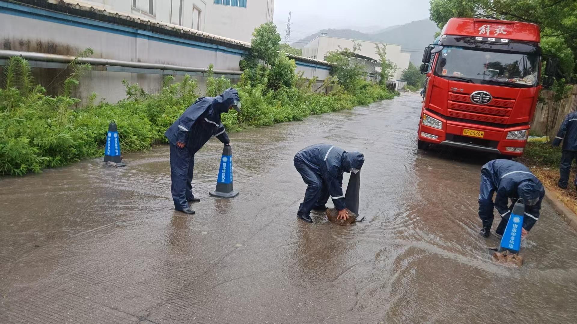 象山縣大徐執(zhí)法中隊(duì)則面臨另一場(chǎng)考驗(yàn)。受強(qiáng)降雨影響,軍民塘水位暴漲需緊急開閘泄洪。然而,部分村民為捕撈被沖出的魚群,不顧危險(xiǎn)靠近湍急水域。大徐執(zhí)法隊(duì)迅速啟動(dòng)應(yīng)急預(yù)案,聯(lián)合屬地力量,設(shè)置警戒線、開啟高音喇叭循環(huán)警示、進(jìn)行不間斷巡查,及時(shí)勸離圍觀撈魚群眾50余人次,有效防止了溺水、滑倒等安全事故,并向村民普及臺(tái)風(fēng)天安全知識(shí)。奉化溪口鎮(zhèn)執(zhí)法隊(duì)組建的市政排水應(yīng)急突擊隊(duì)成為風(fēng)雨中的“清道夫”。隊(duì)員們無畏艱險(xiǎn),逆風(fēng)而上,冒雨處置巡查中發(fā)現(xiàn)的倒伏樹木、斷枝、散落廣告布等路面障礙物,在積水嚴(yán)重的路段,他們?cè)O(shè)置警示標(biāo)志,協(xié)助排水部門緊急疏浚管道,清理堵塞的雨水箅子,爭(zhēng)分奪秒加快排水速度。