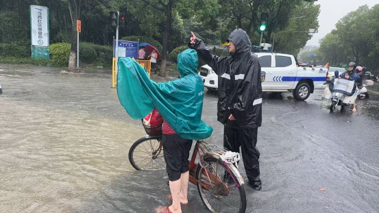江北區(qū)綜合行政執(zhí)法局在臺(tái)風(fēng)登陸前,爭(zhēng)分奪秒強(qiáng)化風(fēng)險(xiǎn)排查。執(zhí)法人員方璐在老外灘街區(qū)巡查時(shí),敏銳發(fā)現(xiàn)某酒吧將幾摞未使用的瓦片堆放在屋頂,存在重大安全隱患。“你們趕緊找人把這些瓦片拿下來!”她立即與負(fù)責(zé)人溝通,明確告知違法風(fēng)險(xiǎn),現(xiàn)場(chǎng)監(jiān)督清理,及時(shí)消除了一處“頭頂上的隱患”。同時(shí),該局組織力量對(duì)戶外廣告、在建工地圍擋、道路下穿等關(guān)鍵部位進(jìn)行高頻次巡查,提前在江安路、康橋南路下穿、通寧路、洪塘西路等易積水路段設(shè)置警示樁和警戒線。莊橋中隊(duì)指導(dǎo)員江維海在積水中連續(xù)站立一小時(shí),逆著風(fēng)雨,一邊攙扶市民安全通過,一邊大聲提醒過往車輛注意水深、謹(jǐn)慎慢行,嗓子喊啞了也顧不上休息。