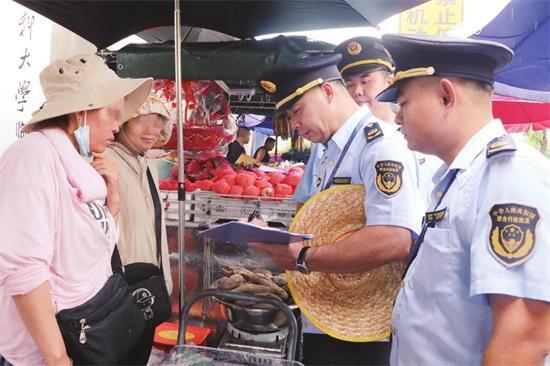 執(zhí)法人員向攤主普法說(shuō)理。