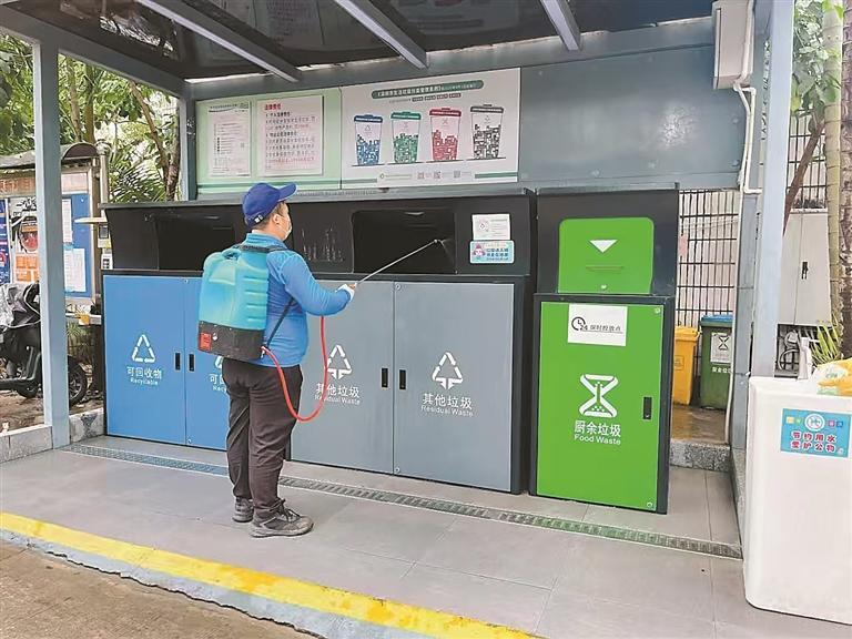 環(huán)衛(wèi)工人對垃圾分類投放點進行消殺。