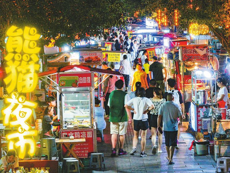 夜色中,熊貓夜市的100余個(gè)攤位陸續(xù)支起,食物的香味四下彌漫,居民游客陸續(xù)到來,或穿梭游走,或駐足光顧。到第二天一早,這段道路又變得寬敞干凈,路面幾乎看不出昨夜煙火升騰的痕跡。