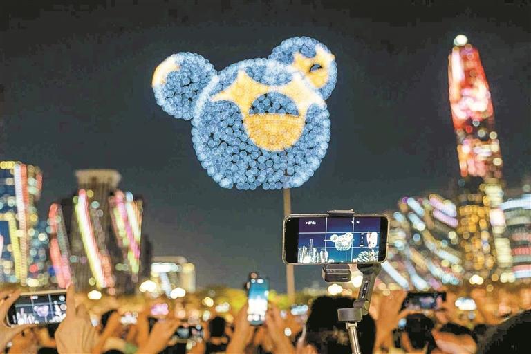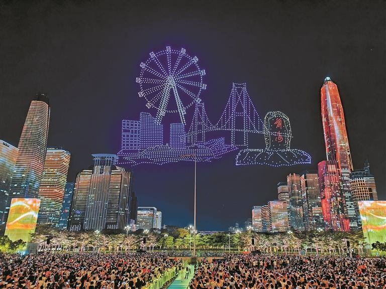 當(dāng)無人機(jī)陣列掠過夜空,地面建筑群也將隨之脈動(dòng)。流光從云端灑向樓宇,色彩如呼吸般明滅變幻,天地連成一體。霓虹勾勒出特區(qū)發(fā)展長(zhǎng)卷,光影流轉(zhuǎn)中浮現(xiàn)特區(qū)精神的時(shí)代符號(hào)——這是一座城市向自己的生日深情致敬。