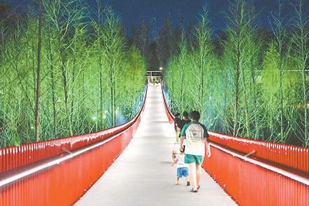 離開液店再向東,過了宋莊路,就來到了涼水河畔的霧森水廊區(qū)。從涼水河主河道引出的水系,蜿蜒在綠樹間,一艘艘透明的小船在湖面上游蕩,尤其是夜幕降臨后,燈光秀一亮,水域瞬間變成了夢幻的童話世界。128米長的聽風橋,從變幻著色彩的森林間穿過,隨便一拍就是大片。林下市集的烤肉和咖啡的香味,則讓煙火氣十足。
