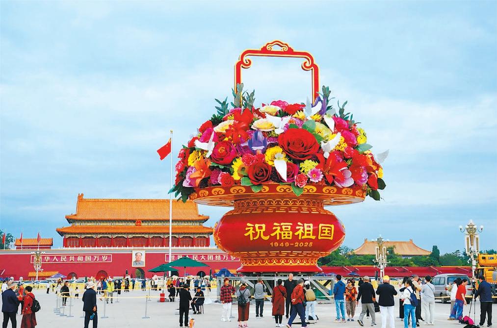 9月22日清晨,天安門廣場(chǎng)中心“祝福祖國(guó)”花籃亮相。游客們駐足拍照,流連忘返。美麗的花籃還吸引了很多麻雀在花叢中穿梭嬉戲。 記者 王海欣 攝