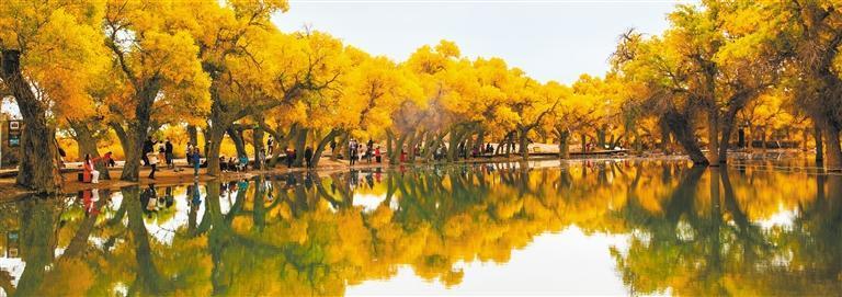 10月10日,游客在內蒙古額濟納旗大漠胡楊林景區(qū)游玩。額濟納旗境內現有天然胡楊林約44萬畝,是世界僅存的三大胡楊林之一。 王穩(wěn)鎖攝(中經視覺)