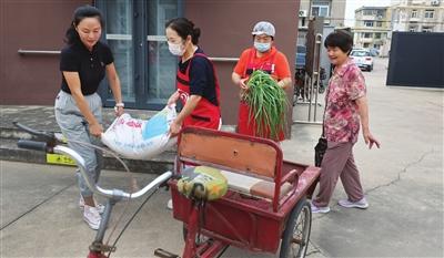 高憲娥老人(右一)用三輪車?yán)瓉?lái)一袋面粉和自家種的大蔥。