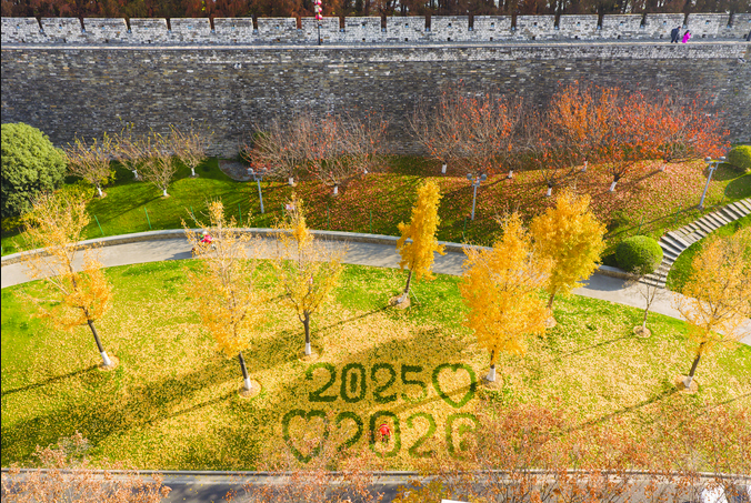 12月6日,在南京市玄武區(qū)玄武門城墻邊神武路,南京園林工人劉金頂用金燦燦的銀杏葉擺出“2025愛2026”圖案,引市民游客排隊打卡。兩組年份“2025”“2026”與兩顆依偎的愛心,在古老墻根下組成一份跨越時光的溫暖期許。(記者 閆春旭 通訊員 許韋國)