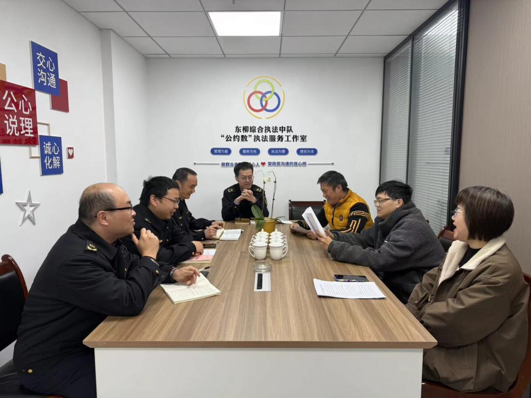 圖為東柳中隊(duì)在“公約數(shù)”執(zhí)法服務(wù)工作室與企業(yè)協(xié)商解決問(wèn)題