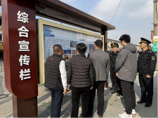 圖為執(zhí)法人員在綜合宣傳欄引導(dǎo)商戶自治