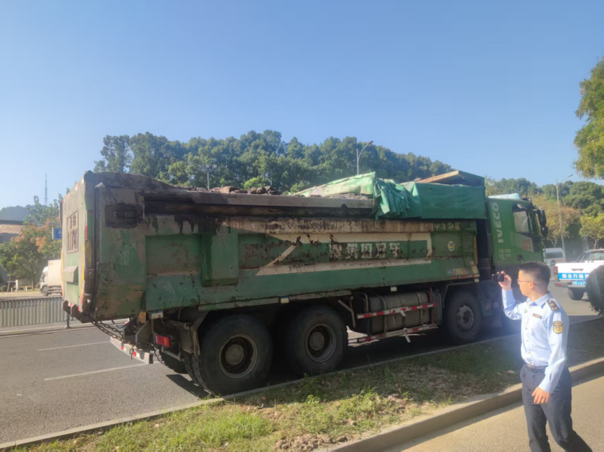 上午9時許,一輛重型自卸貨車在滸山街道西二環(huán)路右轉(zhuǎn)彎拐入慈甬路,行駛至慈甬路與西二環(huán)路交叉口往西200米處時被執(zhí)法人員叫停檢查。經(jīng)檢查,該車滿載建筑垃圾,數(shù)量約為20立方米,主要成分為渣土。該車車載裝置設(shè)備開啟,相關(guān)平臺能顯示車輛行駛軌跡,但未發(fā)現(xiàn)電子轉(zhuǎn)移聯(lián)單登記。
