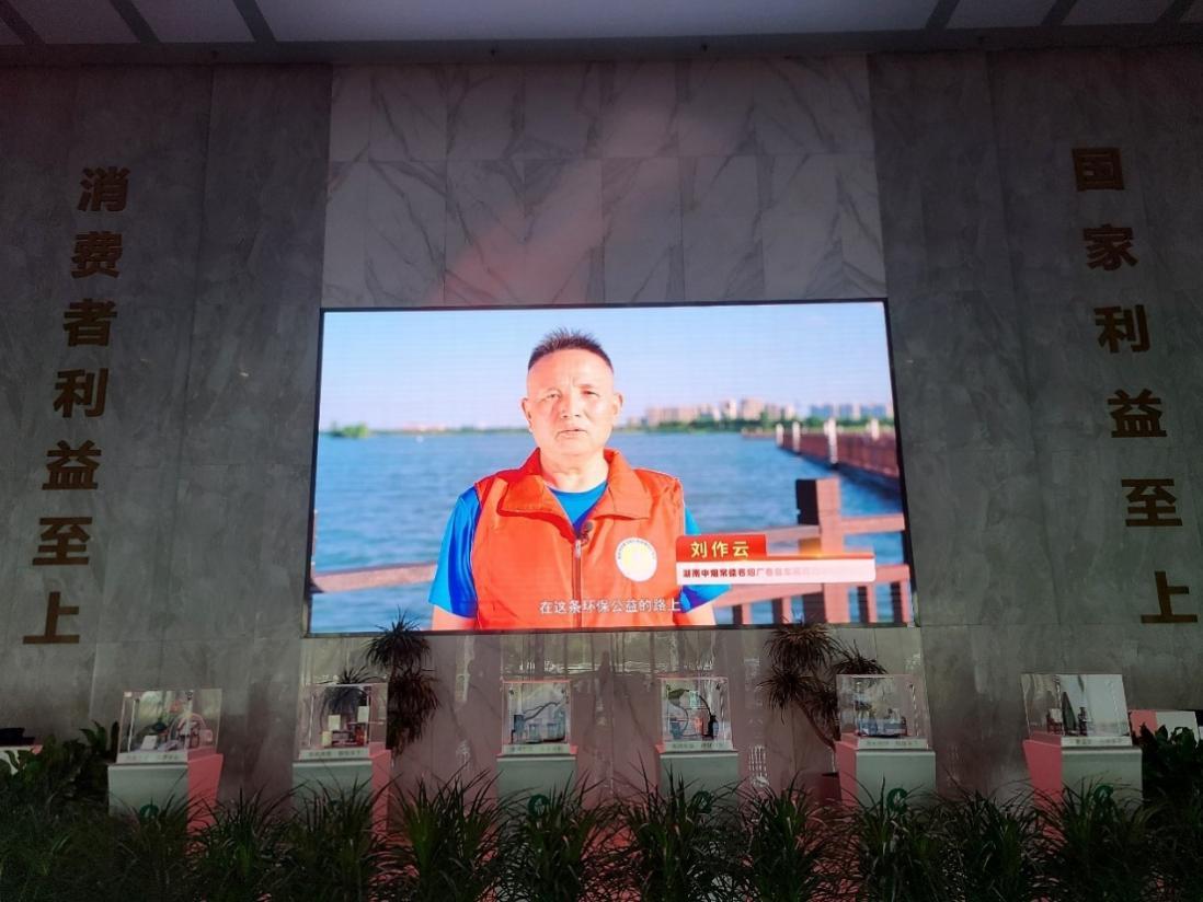 圖為車間大屏播放工廠員工參與環(huán)保公益的宣傳片