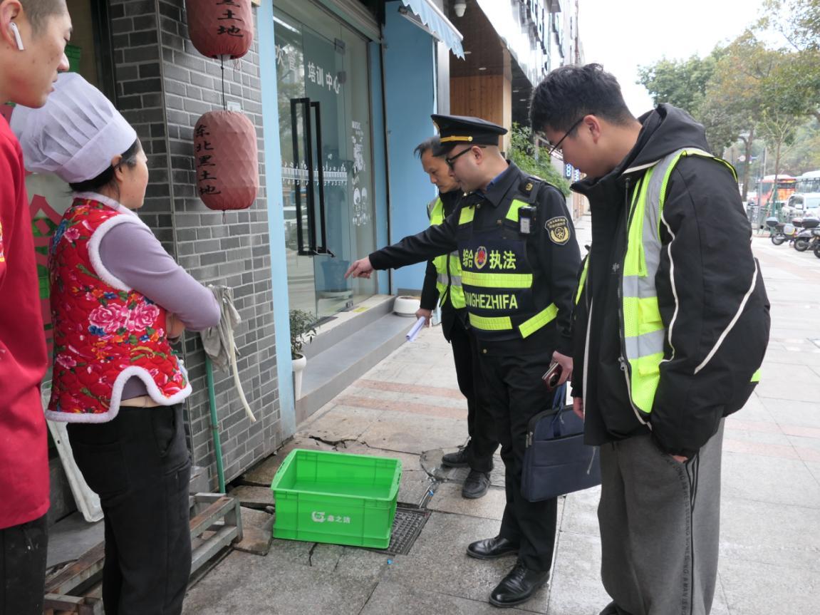 群眾的急難愁盼就是執(zhí)法的發(fā)力點。了解情況后,綜合行政執(zhí)法局立即啟動協(xié)同治理機制,第一時間協(xié)調(diào)排水公司、屬地街道執(zhí)法隊組成聯(lián)合幫扶小組,直奔現(xiàn)場“把脈開方”。針對店鋪的實際困境,幫扶小組敲定了一套簡單易行的整改方案:在店門口原有自來水管的基礎上,將排水管道從雨水井改接到街道污水井;同時在水龍頭下方增設專用洗碗池,從源頭實現(xiàn)污水的規(guī)范收集與排放。