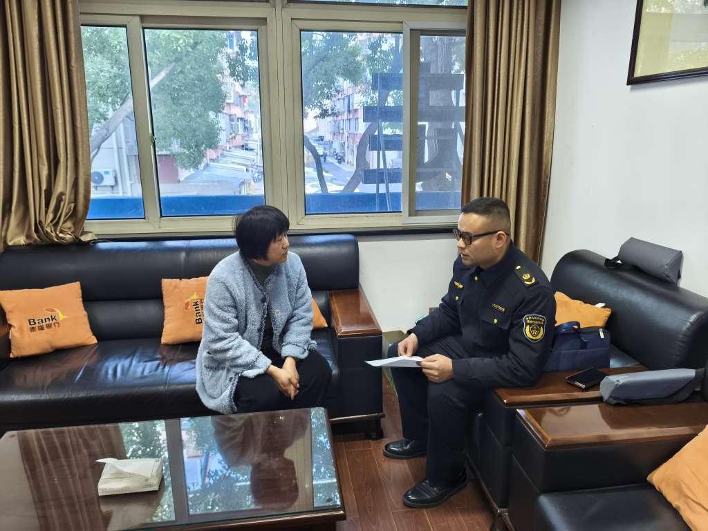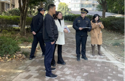 圖為執(zhí)法人員與物業(yè)工作人員交流