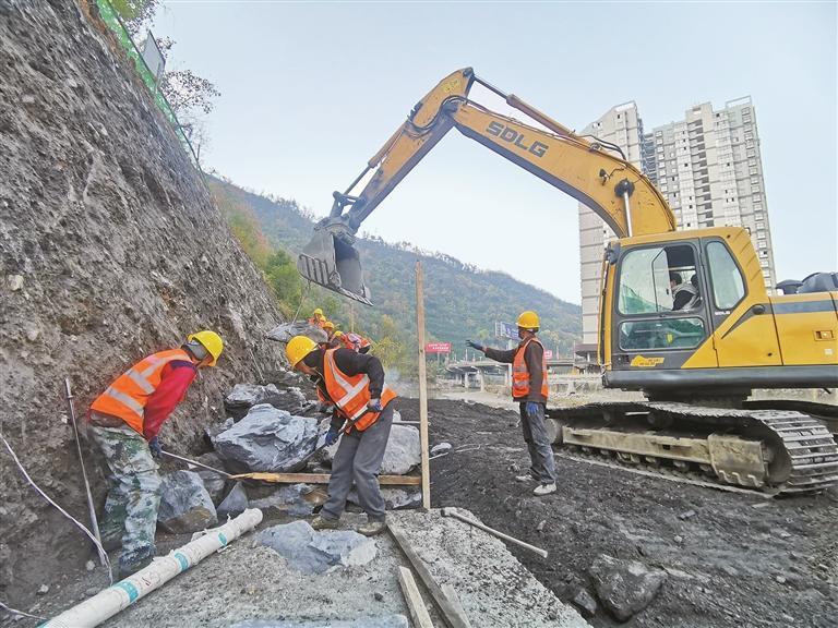 1月12日,在白河縣城區(qū)向榮—獅子山道路建設(shè)項(xiàng)目現(xiàn)場(chǎng),工人在進(jìn)行路段肩墻砌筑工程施工。通訊員 鄒益山攝