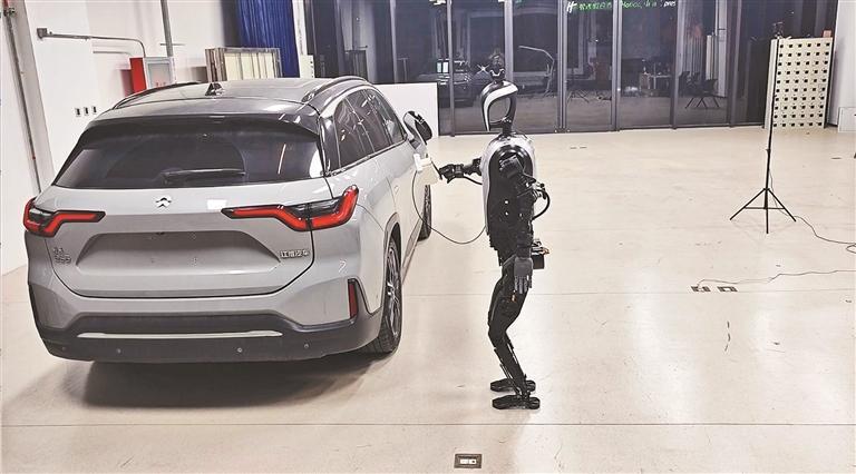 樂聚夸父人形機(jī)器人在測(cè)試場(chǎng)景中為車輛充電。