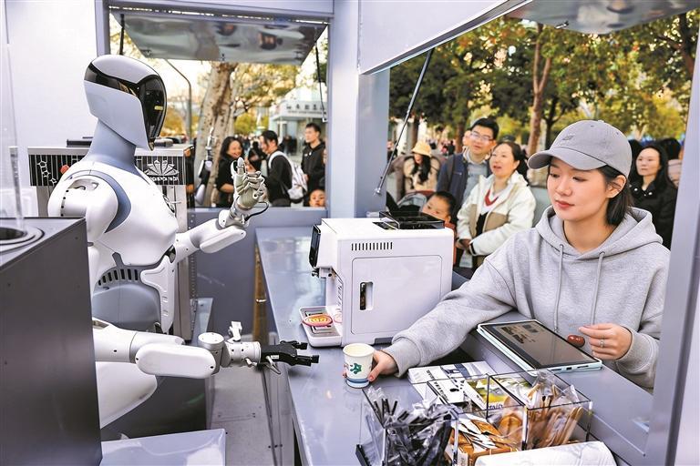 深圳人才公園的智平方機(jī)器人憑借靈活的機(jī)械臂現(xiàn)場(chǎng)為游客制作咖啡。深圳特區(qū)報(bào)記者 周紅聲 潘康 曹鵬飛 攝