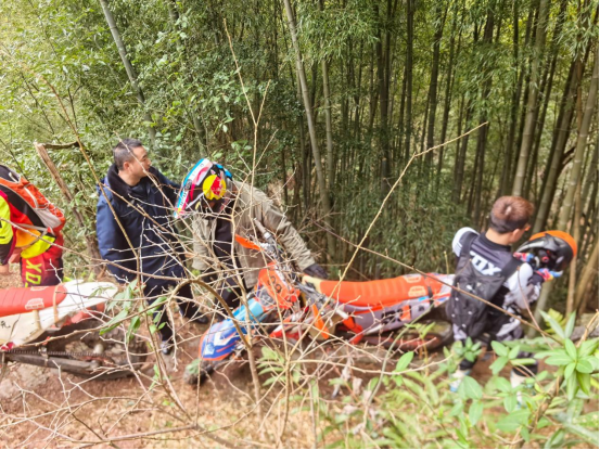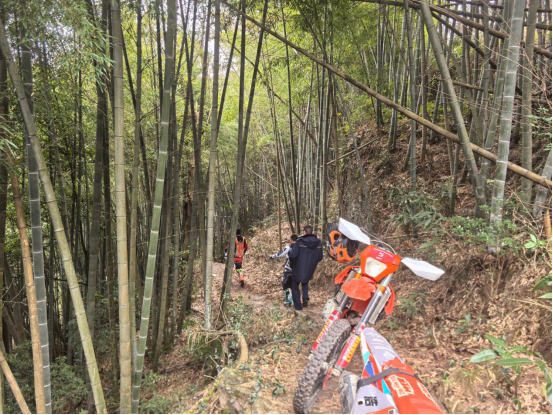 騎友們急在心頭,嘗試推車、墊土等方法脫困均無(wú)果。深山古道偏僻,無(wú)行人可求助,大家一時(shí)束手無(wú)策。就在一籌莫展之際,正在周邊開(kāi)展常態(tài)化安全隱患排查的溪口鎮(zhèn)綜合行政執(zhí)法隊(duì)隊(duì)員恰好經(jīng)過(guò)??吹奖焕闆r,隊(duì)員們立即停車上前,詢問(wèn)情況、查看路況,迅速投入救援。