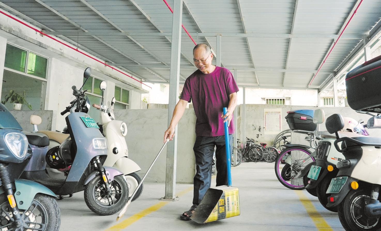 近日,在美蘭區(qū)和平南街道海潤(rùn)花園小區(qū),物業(yè)工作人員正在打掃電動(dòng)自行車棚衛(wèi)生。記者 楊忠凱 攝