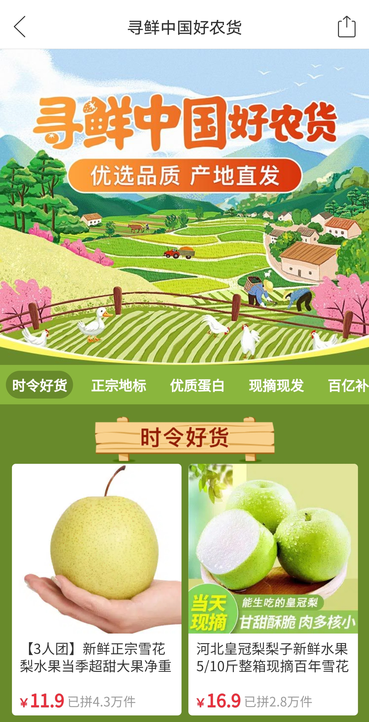 活動(dòng)期間,消費(fèi)者打開拼多多app,搜索“尋鮮中國”“多多好農(nóng)貨”“好農(nóng)貨”等關(guān)鍵詞,即可直達(dá)專區(qū),選購時(shí)令地標(biāo)農(nóng)貨。