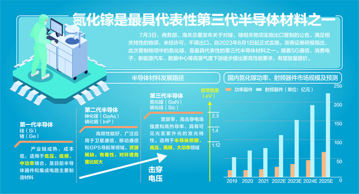 《公告》指出,滿足以下特性的物項,未經(jīng)許可,不得出口。鎵相關(guān)物質(zhì),包括金屬鎵(單質(zhì))(參考海關(guān)商品編號:8110929010、8112929090、8112999000)、氮化鎵(包括但不限于晶片、粉末、碎料等形態(tài))(參考海關(guān)商 品 編 號 :2850001901、3818009001、3825690001)等。