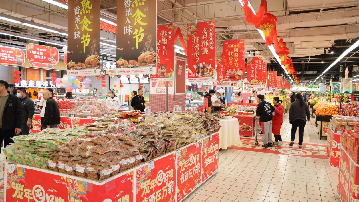 在蘇果南京將軍大道店,喜氣洋洋的龍年年貨節(jié)海報、吊旗裝飾了整個賣場,各式休閑食品、酒水、牛奶酒水禮盒,鮮活的水產(chǎn)、新鮮的果蔬、來自全國各地的土特產(chǎn)、龍年飾品、吉祥物等琳瑯滿目,蘇果超市“年貨節(jié)”呈現(xiàn)一片紅火和欣欣向榮的熱鬧景象。不少消費(fèi)者推著購物車提前選購心儀的年貨和伴手禮?!懊磕甑倪@個時候家里都會提前備年貨和福字紅包等年節(jié)商品,錯開節(jié)前一周的購買高峰?!笔忻裰馨⒁瘫硎?。