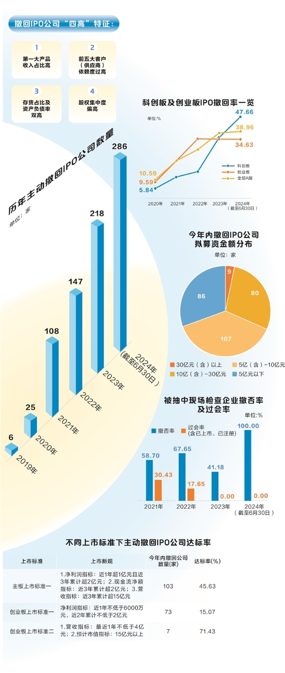 嚴(yán)監(jiān)管威力逐漸顯現(xiàn),企業(yè)在IPO申報時更加審慎考慮是否“夠格”。據(jù)證券時報·數(shù)據(jù)寶統(tǒng)計,按公告日計算,截至6月30日(下文統(tǒng)計的時間截點均為該日),今年內(nèi)共有286家主動撤回IPO申請的公司(以下簡稱“撤回IPO公司”),數(shù)量已超過去年全年的218家,創(chuàng)下歷史新高。
