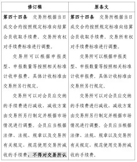 第四十四條規(guī)定,交易所可以對會員應(yīng)交納的手續(xù)費進行減收,減收方案由交易所另行制定并根據(jù)市場情況進行調(diào)整。會員應(yīng)當根據(jù)法律、法規(guī)、規(guī)章以及交易所有關(guān)規(guī)定,規(guī)范使用交易所減收的手續(xù)費,不得對交易所認定的高頻交易者進行手續(xù)費減收。其中,“不得對交易所認定的高頻交易者進行手續(xù)費減收”為新增內(nèi)容。