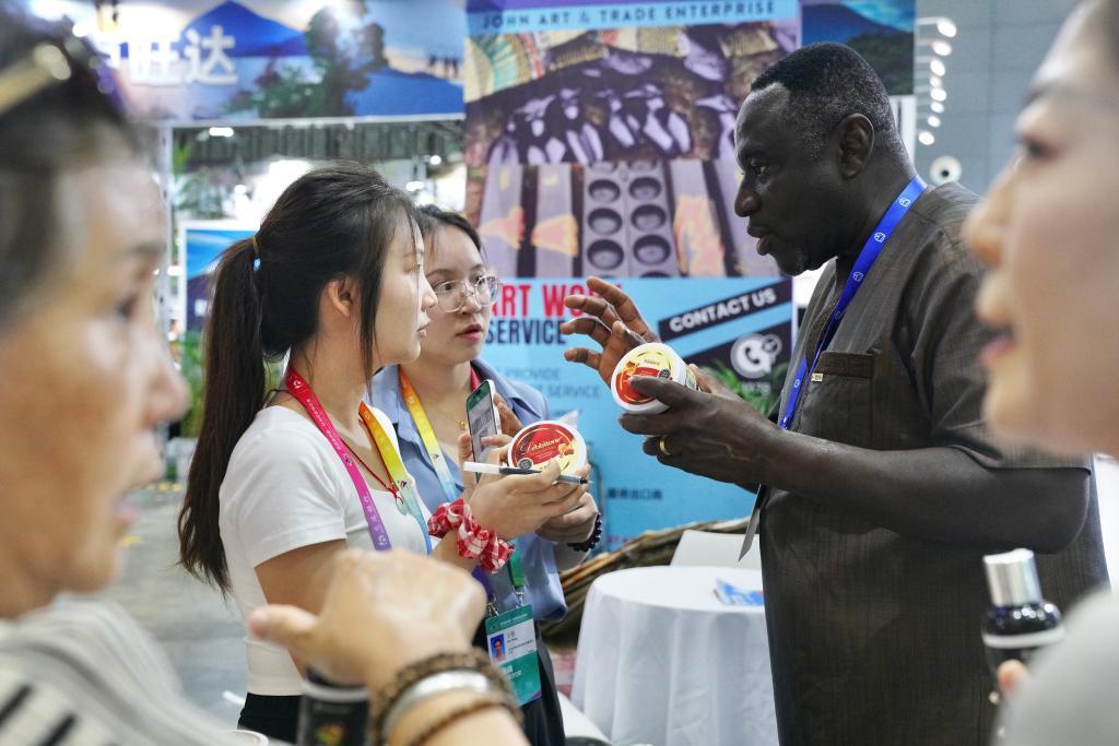 不遠(yuǎn)處的布隆迪展區(qū),當(dāng)?shù)卦现圃斓睦蹦咀延?、辣木籽身體香膏也吸引著不少專業(yè)觀眾前來(lái)問(wèn)詢、試用。短短半天,已有20多個(gè)采購(gòu)商留下對(duì)接方式。