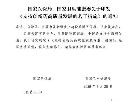 據(jù)國家醫(yī)保局網(wǎng)站消息,國家醫(yī)保局、國家衛(wèi)生健康委6月30日印發(fā)《支持創(chuàng)新藥高質量發(fā)展的若干措施》。其中提到,加大創(chuàng)新藥研發(fā)支持力度,支持創(chuàng)新藥進入基本醫(yī)保藥品目錄和商業(yè)健康保險創(chuàng)新藥品目錄,支持創(chuàng)新藥臨床應用,提高創(chuàng)新藥多元支付能力。