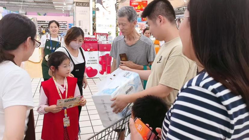 “這是100%橙汁,不含添加劑,最近天氣熱,您一定很需要!”7月5日,蘇果超市清涼門店內(nèi),10歲的萌娃推薦官小宋正熟練地向顧客介紹潤(rùn)家橙汁。他戴上定制工牌,身穿紅色小馬甲,儼然一副“職場(chǎng)精英”模樣。