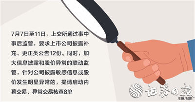 監(jiān)管部門加大事中事后監(jiān)管。比如,僅7月7日至11日期間,上交所就要求上市公司披露補(bǔ)充、更正類公告12份。同時(shí),加大信息披露和股價(jià)異常的聯(lián)動(dòng)監(jiān)管,針對(duì)公司披露敏感信息或股價(jià)發(fā)生明顯異常的,提請(qǐng)啟動(dòng)內(nèi)幕交易、異常交易核查8單。